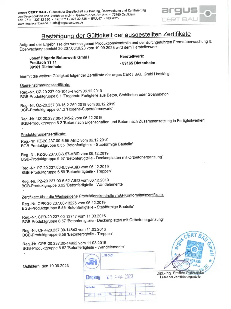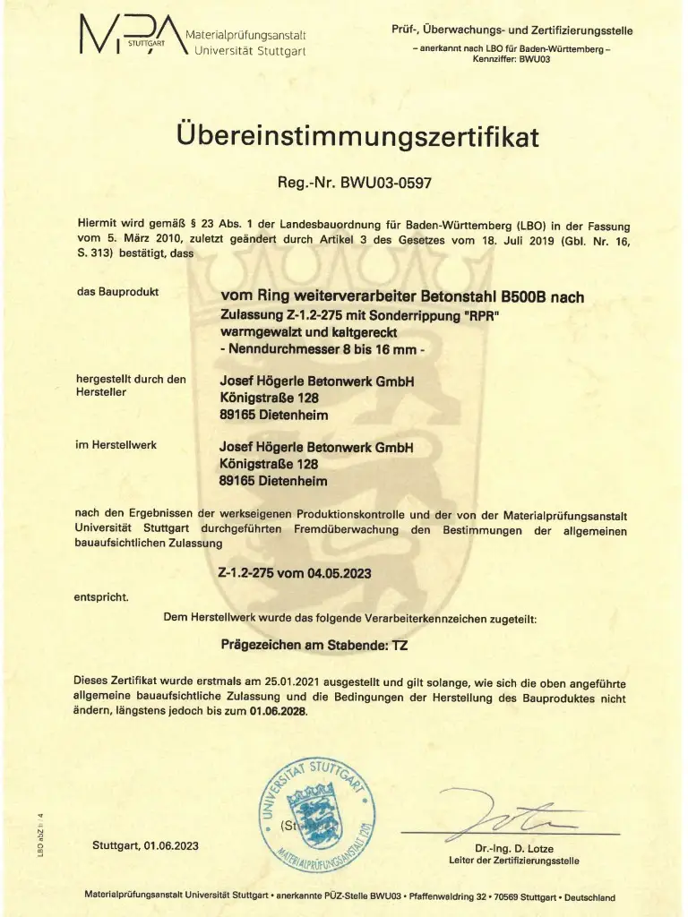 Das Übereinstimmungszeichen kennzeichnet Bauprodukte, die den maßgeblichen technischen Regeln, der bauaufsichtlichen Zulassung, dem bauaufsichtlichen Prüfzeugnis oder der Zustimmung im Einzelfall entsprechen. Für Anwender von Bauprodukten ist es von größter Bedeutung, ausschließlich qualitativ hochwertige, normgerechte Produkte einzusetzen. Alle Mitglieder des Güteschutz Beton weisen durch eine freiwillige und unabhängige Fremdüberwachung nach, dass ihre Produkte die technischen Anforderungen sicher einhalten.